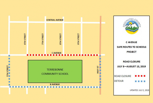 C Avenue in Terrebonne will be temporarily closed between Hwy 97 and 6th Street beginning Monday, July 8. The closure is to allow for the construction of sidewalks, on-street parking areas, storm sewer facilities, and other improvements along the frontage of Terrebonne Community School as part of the C Avenue Safe Routes to Schools project. The road closure is anticipated to be in effect through Tuesday, August 13. A detour route will be provided for the duration of the project.