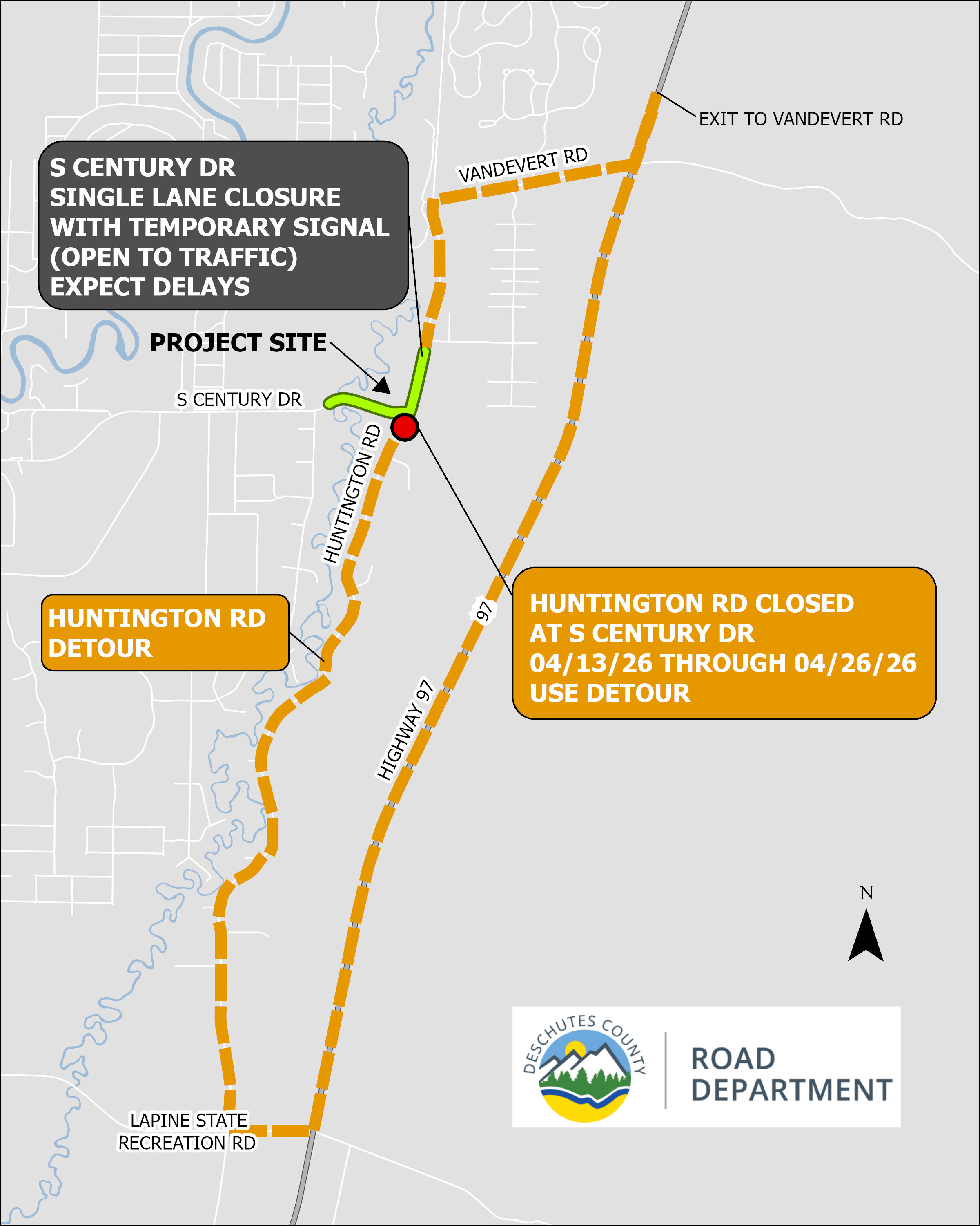 Huntington Road will be closed to all traffic from the South Century Drive intersection to about 500 feet south of the intersection. Drivers can detour around the closure using Vandevert Road, U.S. 97 and State Recreation Road (see map).